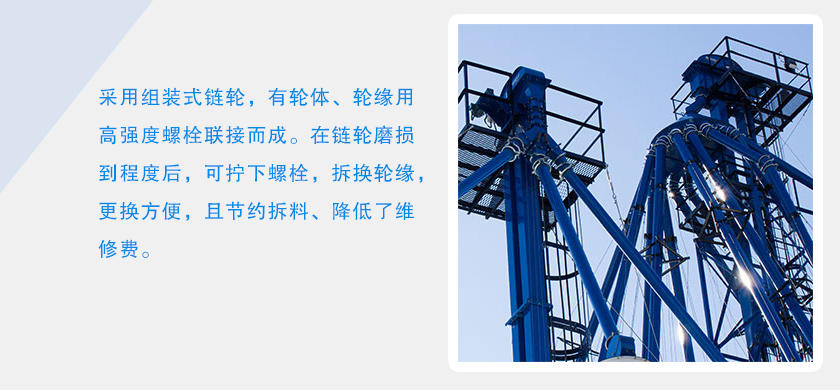 4、采用組裝式鏈輪,有輪體、輪緣用高強度螺栓聯(lián)接而成。在鏈輪磨損到程度后,可擰下螺栓,拆換輪緣,更換方便,且節(jié)約拆料、降低了維修費。