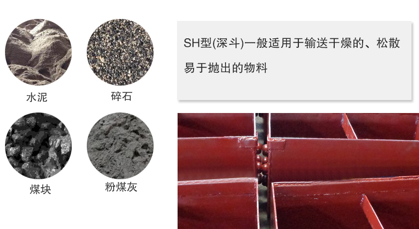 該系列斗式提升機備有二種料斗:ZH型(中深斗)一般適用于輸送濕的、易結(jié)塊、較難拋出的物料,如濕砂、化肥、堿肥、堿粉等。SH型(深斗)一般適用于輸送干燥的、松散易于拋出的物料,如水泥、碎石、煤塊等。
