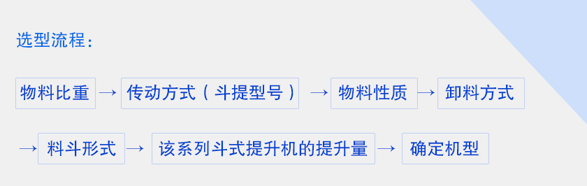 物料比重→傳動方式(斗提型號)→物料性質(zhì)→卸料方式→料斗形式→該系列斗式提升機的提升量→確定機型。