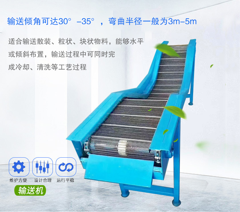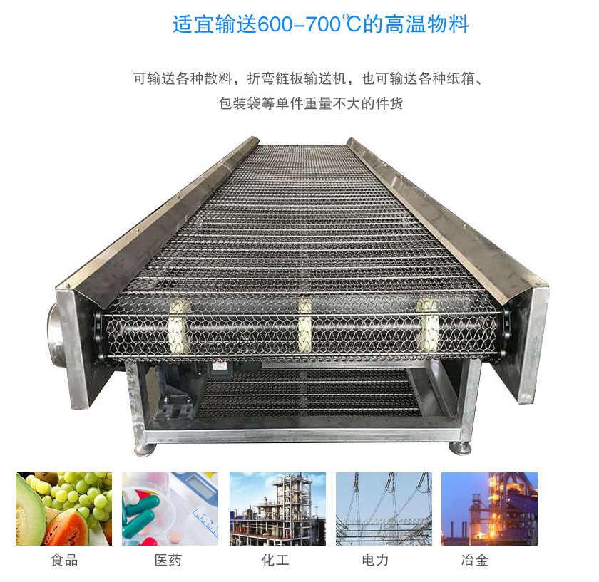 鏈板輸送機采用鏈板輸送帶180°鏈板輸送機用于銜接,與其他輸送設備配合使用能充分節省空間并能起到良好的輸送效果。轉彎角度可分:60°、90°、180°??奢斔偷奈锪戏N類繁多,既可輸送各種散料,折彎鏈板輸送機,也可輸送各種紙箱、包裝袋等單件重量不大的件貨,廣泛應用于食品、醫藥、化工、電力、冶金等行業,適宜輸送600-700℃的高溫物料。