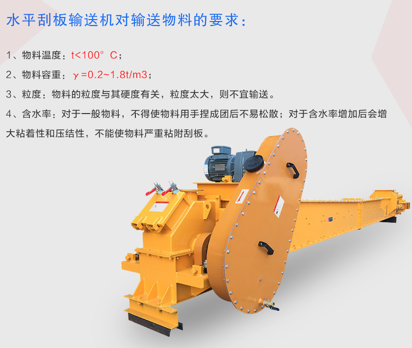 水平刮板輸送機(jī)是指水平方向上輸送粉狀及顆粒狀物料的設(shè)備,可單點(diǎn)或多點(diǎn)進(jìn)料,出料,水平刮板輸送機(jī)分為普通型、密封型和特殊型三類,采用密封式設(shè)計(jì),可防止粉塵污染.