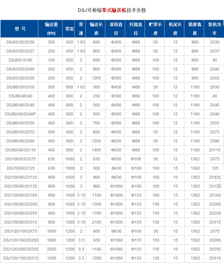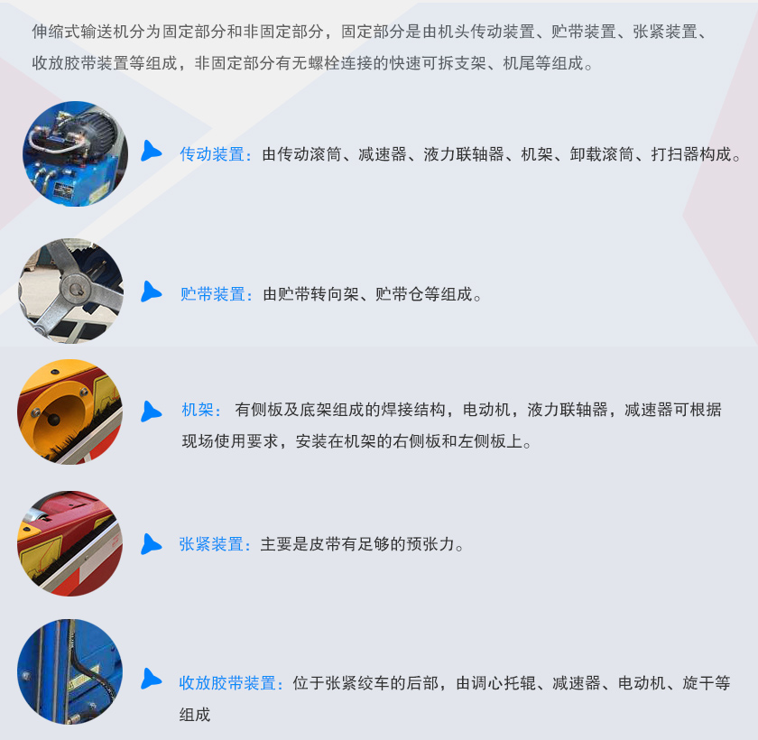 伸縮式輸送機(jī)分為固定部分和非固定部分,固定部分是由機(jī)頭傳動(dòng)裝置、貯帶裝置、張緊裝置、收放膠帶裝置等組成,非固定部分有無螺栓連接的快速可拆支架、機(jī)尾等組成。