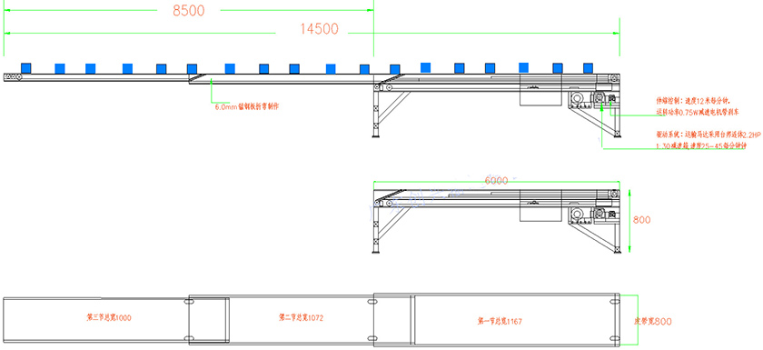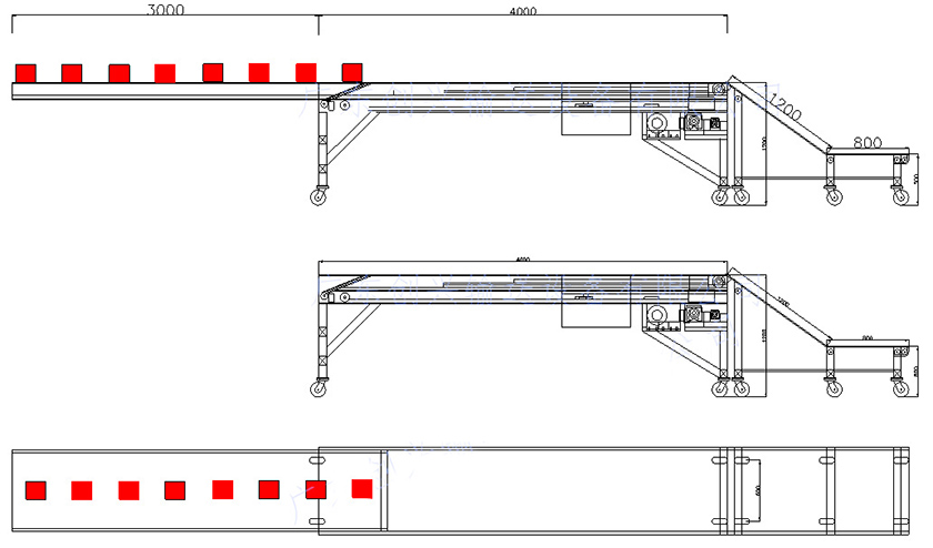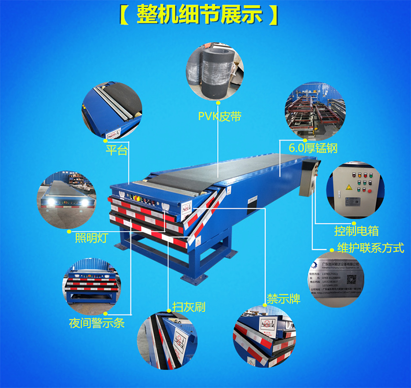 2、可按照用戶要求調(diào)節(jié)按鈕,隨時(shí)控制輸送機(jī)的長度,底部安裝升降裝置殼隨時(shí)控制輸送機(jī)端部的高度。