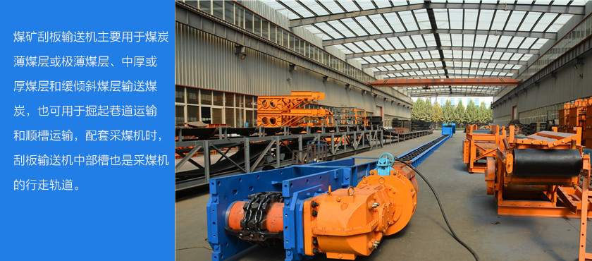煤礦刮板輸送機主要用于煤炭薄煤層或極薄煤層、中厚或厚煤層和緩傾斜煤層輸送煤炭,也可用于掘起巷道運輸和順槽運輸,配套采煤機時,刮板輸送機中部槽也是采煤機的行走軌道。