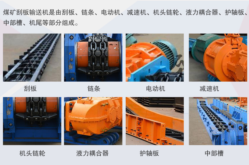 煤礦刮板輸送機是由刮板、鏈條、電動機、減速機、機頭鏈輪、液力耦合器、護軸板、中部槽、機尾等部分組成。