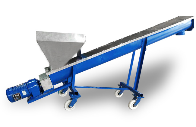 當螺旋軸轉動時,由于物料的重力及其與槽體壁所產生的摩擦力,使物料只能在葉片的推送下沿著輸送機的槽底向前移動,其情況好像不能旋轉的螺母沿著旋轉的螺桿作平移運動一樣。物料在中間軸承的運移,則是依靠后面前進著的物料的推力。所以,物料在輸送機中的運送,完全是一種滑移運動。為了使螺旋軸處于較為有利的受拉狀態,一般都將驅動裝置和卸料口安放在輸送機的同一端,而把進料口盡量放在另一端的尾部附近。 旋轉的螺旋葉片將物料推移而進行輸送,使物料不與螺旋輸送機葉片一起旋轉的力是物料自身重量和螺旋輸送機機殼對物料的摩擦阻力。葉片的面型根據輸送物料的不同有實體面型、帶式面型、葉片面型等型式。螺旋輸送機的螺旋軸在物料運動方向的終端有止推軸承以隨物料給螺旋的軸向反力,在機長較長時,應加中間吊掛軸承。