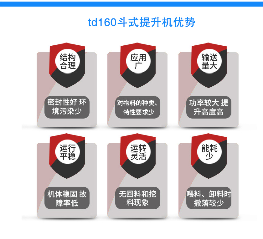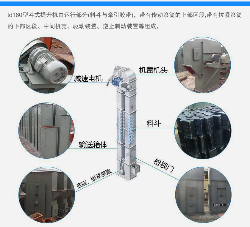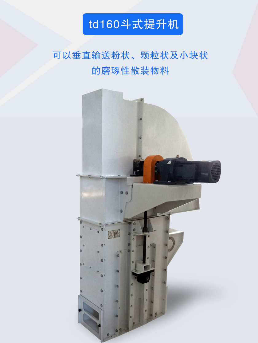 td160斗式提升機主要用于食品、化工、尖刺、冶金、煤炭等行業(yè),適用于垂直輸送粉末、顆粒、小塊狀或磨琢性較小的散裝物料,如糧食、煤、水泥、碎礦石等物料。