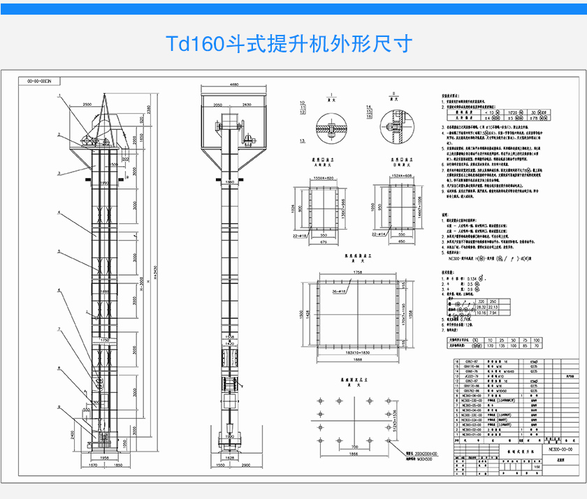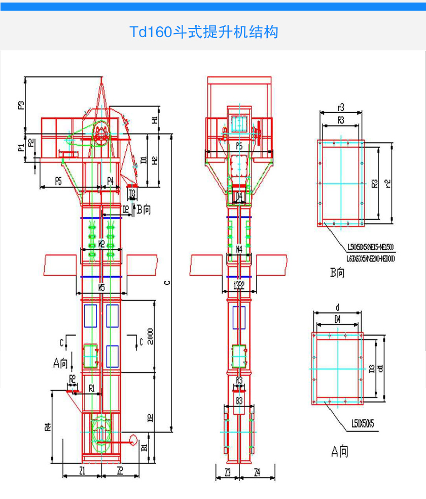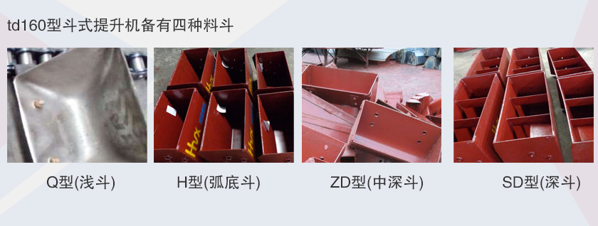 td160斗式提升機斗寬為160mm,斗速為1.4米/秒,是一種小型td斗式提升機,可以垂直輸送粉狀、顆粒狀及小塊狀的磨琢性散裝物料,td160型斗式提升機備有四種料斗Q型(淺斗)、H型(弧底斗)、ZD型(中深斗)SD型(深斗)。