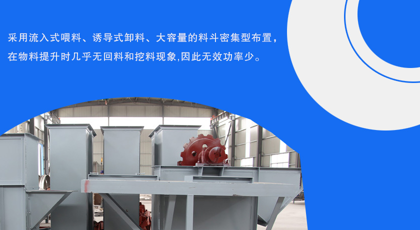 1、采用流入式喂料、誘導(dǎo)式卸料、大容量的料斗密集型布置,在物料提升時幾乎無回料和挖料現(xiàn)象,因此無效功率少。