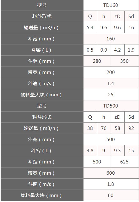 1、表中斗容為計算斗容,輸送量按填充系數(shù)0.6計算得出。