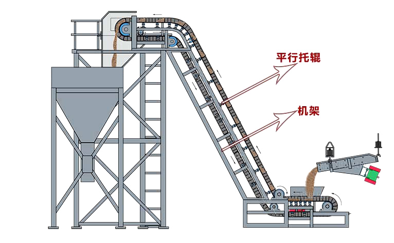 1、下水平段:采用低型中間架腿,用于裝料時平穩裝料,減少裝料時對輸送機的壓力,減少物料散落。