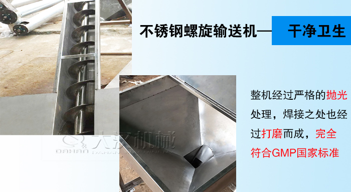我們公司生產(chǎn)的不銹鋼螺旋輸送機(jī)采用精選304、316、316L等不同等級(jí)的不銹鋼材質(zhì),并且整機(jī)經(jīng)過(guò)嚴(yán)格的拋光處理,焊接之處也經(jīng)過(guò)打磨而成,符合食品行業(yè)衛(wèi)生要求。