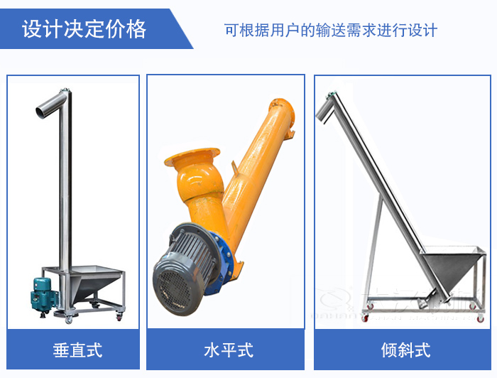螺旋輸送機根據(jù)用戶的要求可以設(shè)計成垂直式的、水平式、傾斜式的,可根據(jù)用戶的輸送需求進行設(shè)計,由于設(shè)計與產(chǎn)品的制造工藝有關(guān),每個廠家對于螺旋輸送機的工藝不同,這就決定了螺旋輸送機價格的高低。