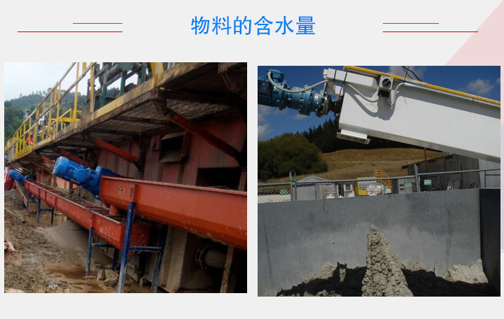 物料含水量的高低會(huì)影響螺旋輸送機(jī)輸送效率,含水量高,物料在輸送過程中極易粘附在螺旋葉片上火輸送機(jī)內(nèi)壁上,長此以往,粘附在葉片和內(nèi)壁上的物料會(huì)增多,造成堵網(wǎng)現(xiàn)象,大大降低螺旋輸送機(jī)的輸送量,長久黏附的物料還需要進(jìn)行人工清除。